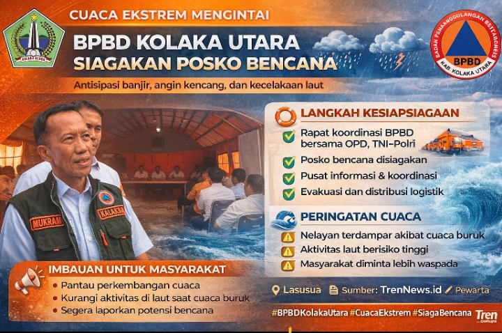 Kepala BPBD Kolaka Utara, Mukramin, SE, MM, kepada Redaksi TrenNews.id, Kamis malam (25/12/2025), mengatakan bahwa peningkatan kesiapsiagaan sangat diperlukan mengingat kondisi cuaca yang tidak menentu dan mulai berdampak di lapangan.