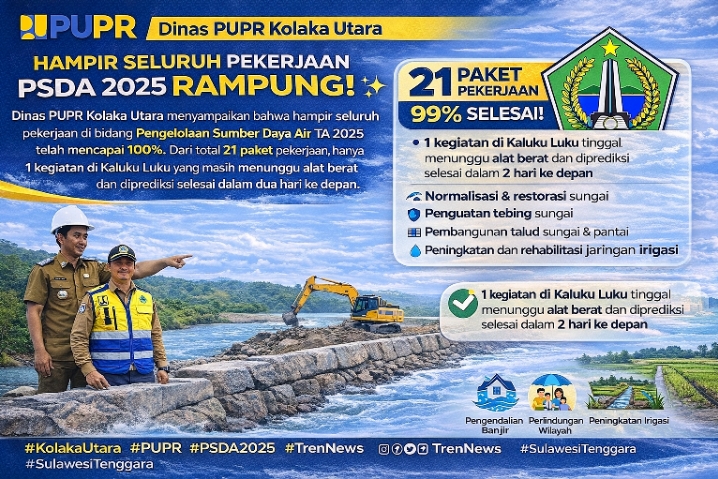 Lasusua, TrenNews.id — Pemerintah Kabupaten Kolaka Utara melalui Dinas Pekerjaan Umum dan Penataan Ruang (PUPR) menyampaikan bahwa seluruh pekerjaan di bidang Pengelolaan Sumber Daya Air (PSDA) Tahun Anggaran 2025 telah mendekati penyelesaian 100 persen. Namun, satu kegiatan masih dalam proses penyelesaian.