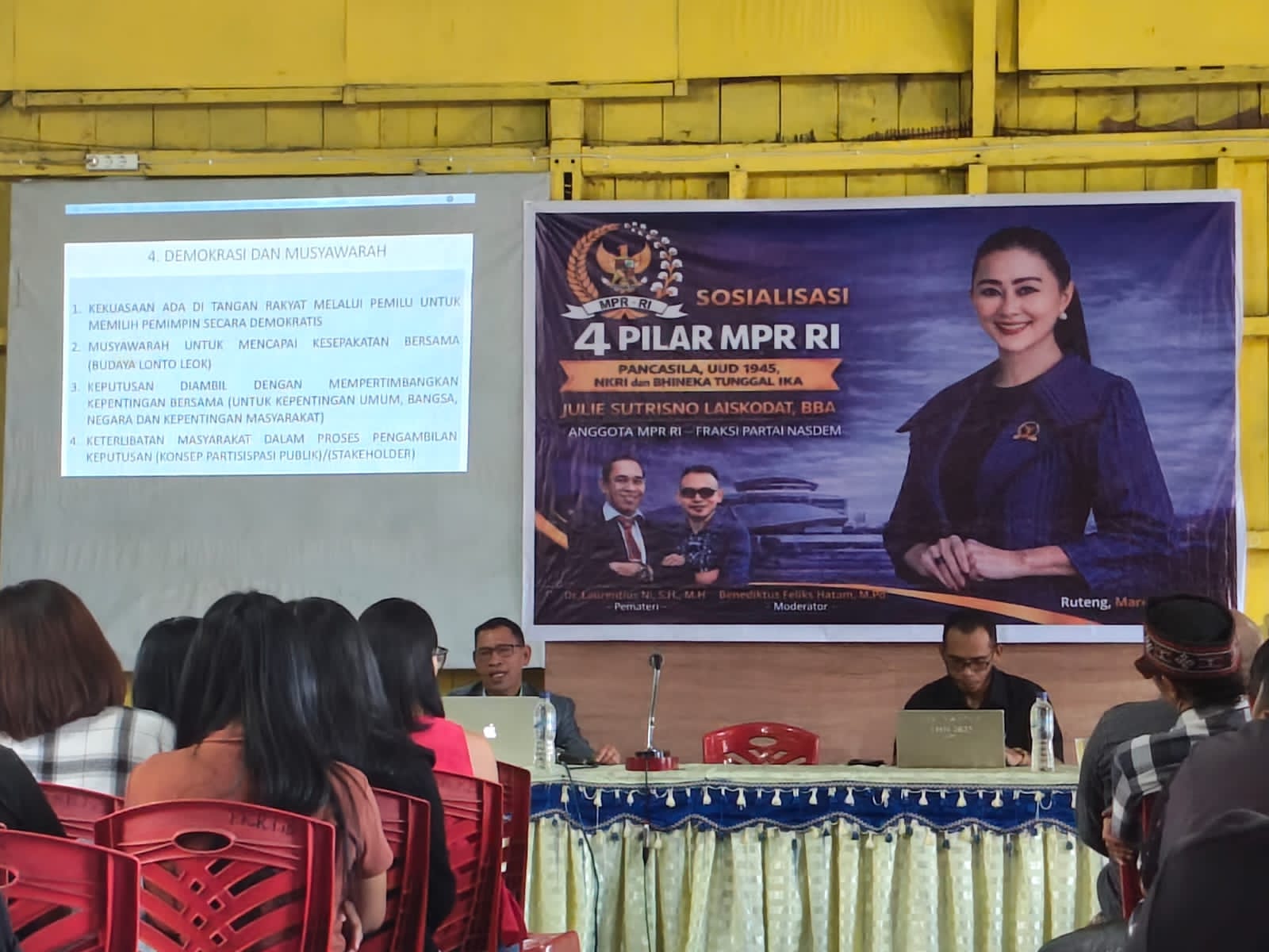 Ratusan peserta dari berbagai kalangan hadiri sosialisasi Empat Pilar Kebangsaan yang diinisiasi oleh Anggota MPR RI Julie Sutrisno Laiskodat,Sabtu(28/3) di Aula Paroki Kristus Raja Ruteng.