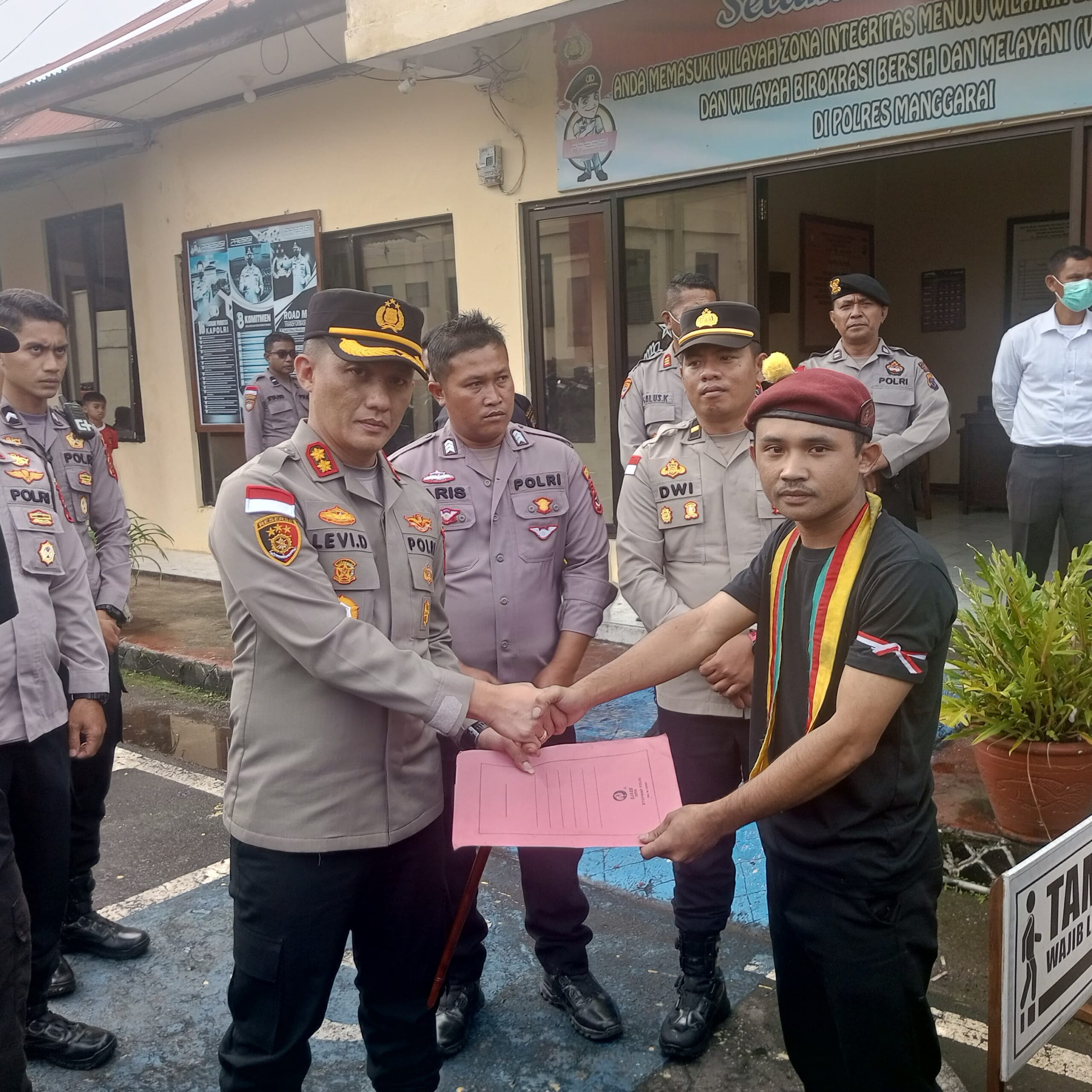 Kapolres Manggarai Levi saat menerima berkas pernyataan sikap dari perwakilan PMKRI Ruteng,pada Kamis(09/4/04/2026).