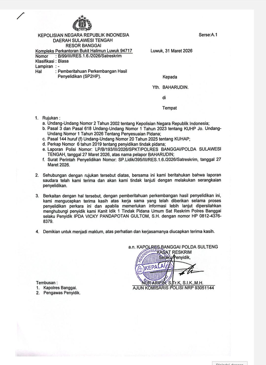 Namun, sorotan tajam justru muncul dari dokumen resmi kepolisian. Surat Pemberitahuan Perkembangan Hasil Penyelidikan (SP2HP) yang dikeluarkan Polres Banggai dinilai minim informasi. Alih-alih memuat perkembangan penyelidikan, dokumen tersebut hanya berisi pernyataan umum tanpa rincian hasil, status perkara, maupun langkah lanjutan.