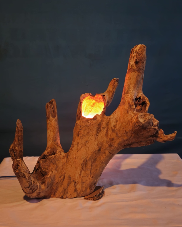 Bagi Maryanto, seni bukan hanya tentang keindahan rupa, tetapi juga tentang memberi kehidupan baru pada sesuatu yang dianggap tak bernilai. Potongan kayu bekas yang biasanya berakhir sebagai limbah, ia olah menjadi lampu hias duduk dengan sentuhan artistik yang menawan. Saat cahaya temaram menembus serat-serat kayu, karya itu menghadirkan suasana hangat dan alami yang menenangkan.