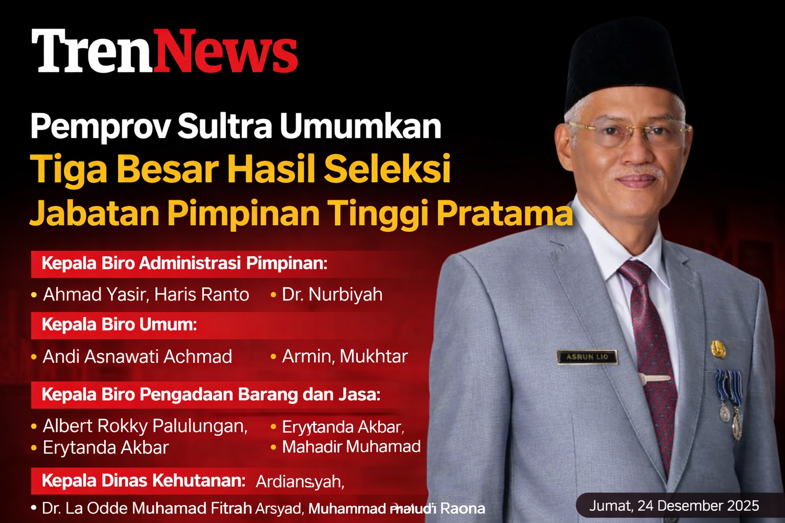Kendari, TrenNews.id – Pemerintah Provinsi Sulawesi Tenggara (Pemprov Sultra) resmi mengumumkan penetapan tiga besar peserta yang dinyatakan lulus seleksi terbuka pengisian Jabatan Pimpinan Tinggi (JPT) Pratama di lingkungan Pemprov Sultra.