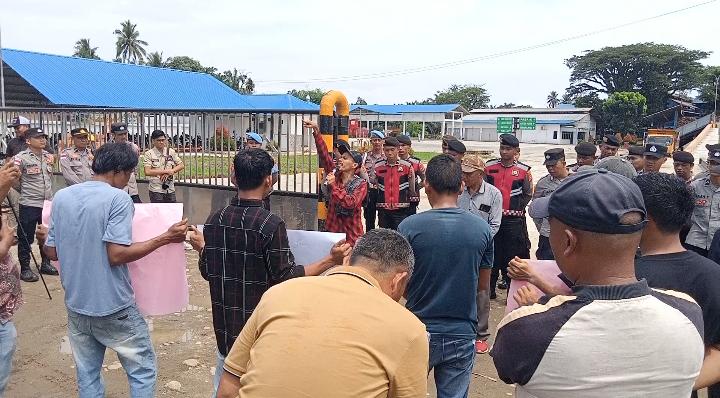 Warga terlihat menyuarakan tuntutan mereka dengan berorasi secara bergantian di depan pabrik PT Socfindo Kebun Lae Butar tersebut.