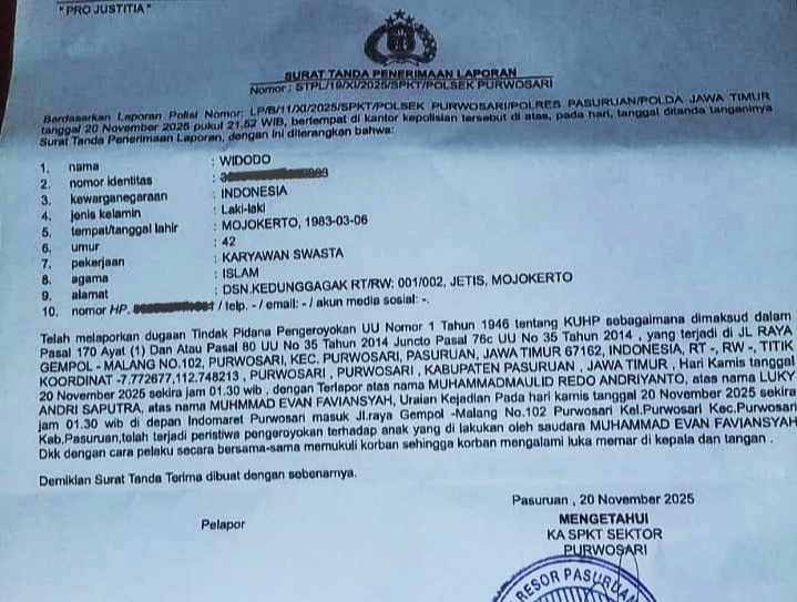 Penanganan perkara dituangkan dalam Laporan Polisi Nomor: LP/B/11/01/2025/SPKT POLSEK PURWOSARI POLRES PASURUAN/POLDA JAWA TIMUR, tertanggal 20 November 2025 pukul 21.52 WIB, dan telah ditandatangani oleh Ka SPKT Aiptu Taufiq Hidajat.