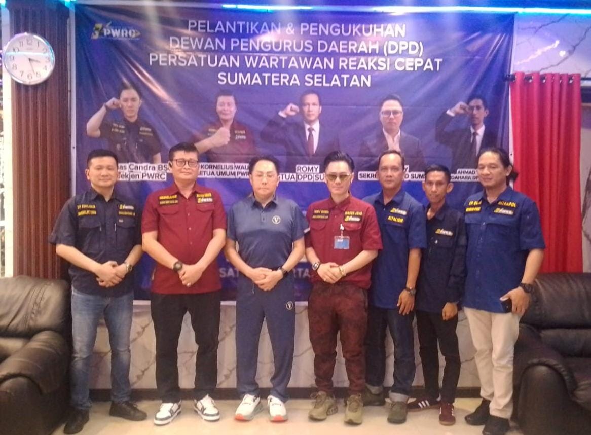 Palembang, TrenNews.id – Ketua Umum Persatuan Wartawan Reaksi Cepat (PWRC), Kornelius Wau, resmi melantik pengurus Dewan Pimpinan Daerah (DPD) PWRC Sumatera Selatan periode 2025–2030 dalam acara yang berlangsung khidmat dan penuh semangat di Darma Agung Palembang, Kamis (20/11/2025).