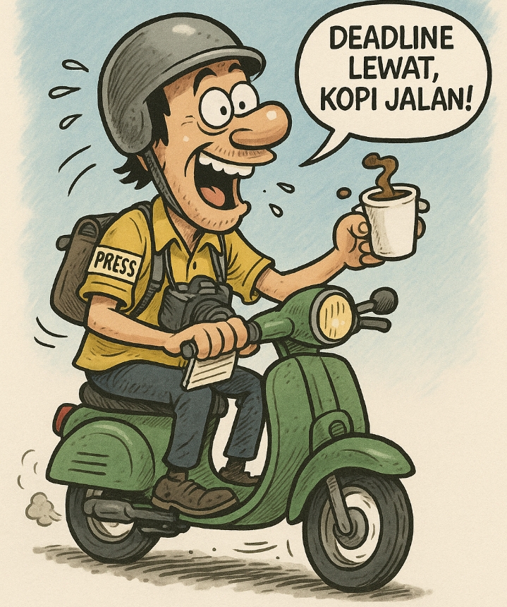 Karikatur insiden ini bahkan sempat viral di grup internal wartawan lokal dengan caption: “Antara idealisme dan kafein, mana yang lebih dulu sampai kantor redaksi?”